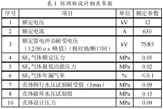 環網柜殼體形狀不同有箱式和筒式之分。由于箱式結構有利于實現進出線.配電方案的實施,但是箱式在承受壓力的局限性,使箱體不能夠承受太高的壓力。下面介紹一種環網柜氣箱的設計方法。與氣箱設計有關的環網柜額定參數見表1。