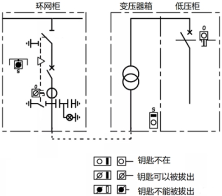 如圖7所示,環(huán)網(wǎng)箱內(nèi)部,阻隔/接地開關(guān)與電纜室門之間的鑰匙聯(lián)鎖,電纜室蓋板翻開后,鑰匙被確定,不能拔出刺進到阻隔開關(guān)鎖,即不能操作接地開關(guān);只需蓋板合上,鑰匙才華拔出,去操作接地開關(guān)分閘。而體系視點,只需接地開關(guān)合閘,鑰匙才華被取出,去開變壓器箱的門,結(jié)束變壓器檢修,一同低壓斷路器不能合閘。
