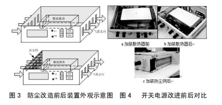 3.2在安裝本體進(jìn)風(fēng)孔加防塵網(wǎng),避免灰塵進(jìn)入安裝內(nèi)部,設(shè)備維護(hù)人員定期對(duì)濾網(wǎng)停止打掃,從而減輕元器件外表覆塵,利于安裝正常散熱,如圖3所示加裝防塵網(wǎng)后開(kāi)關(guān)電源表示圖。對(duì)安裝施行上述改良后,其改良前后比照如圖4所示。