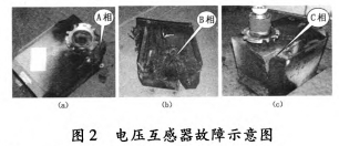 2012年3月26日,檢修人員連夜對35kV垣潔線56號線路電壓互感器進行撤除查看,發現電壓互感器A、B、C相損壞,A、B相有迸裂現象;B相PT損害嚴峻,側壁脫離本體,插頭墜落,繞組完全毀損;A相PT插頭墜落,外表漆層及噴鋁層受損;C相外表漆層及噴鋁層受損,其它部位正常,如圖2所示。